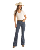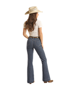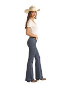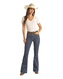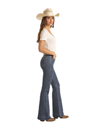 Pantalon taille haute au style western chic, confectionné dans un denim jacquard texturé qui apporte caractère et élégance. Sa coupe trouser évasée crée une silhouette élancée, parfaite pour un look soigné et tendance.