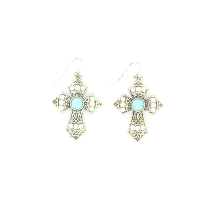 Boucles d’oreilles croix pendantes - Argent, Turquoise & Cristaux