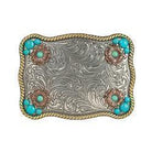 Boucle de ceinture western élégante et raffinée, mariant harmonieusement les tons argent antique, or vieilli et cuivre. Le fond gravé de motifs scroll apporte une texture riche et classique, tandis que les fleurs en cuivre ornées d’une pierre turquoise centrale ajoutent une touche féminine et distinctive. Les pierres turquoise placées aux coins complètent le design avec équilibre et caractère. Une pièce décorative qui allie tradition western et finition haut de gamme.