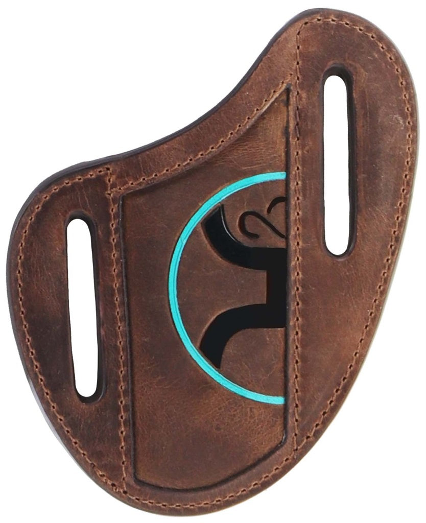 Étui à couteau Pancake 2.0 – Cuir brun embossé – Logo turquoise/noir