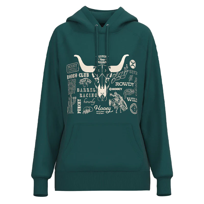 Ce hoodie Round Up se distingue par son visuel western riche et détaillé, mettant en valeur un crâne longhorn entouré d’illustrations emblématiques de l’univers rodeo. Sa teinte vert profond combinée à l’imprimé crème crée un contraste fort et authentique, parfait pour un look western moderne, confortable et affirmé.