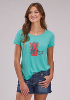 Apportez une touche fraîche et féminine à votre style western avec ce t-shirt Roper en jersey turquoise, orné d’un imprimé central audacieux représentant un collier style navajo avec pendentif. Conçu pour allier confort et originalité, ce haut se distingue par sa matière douce et légère, idéale pour la belle saison.