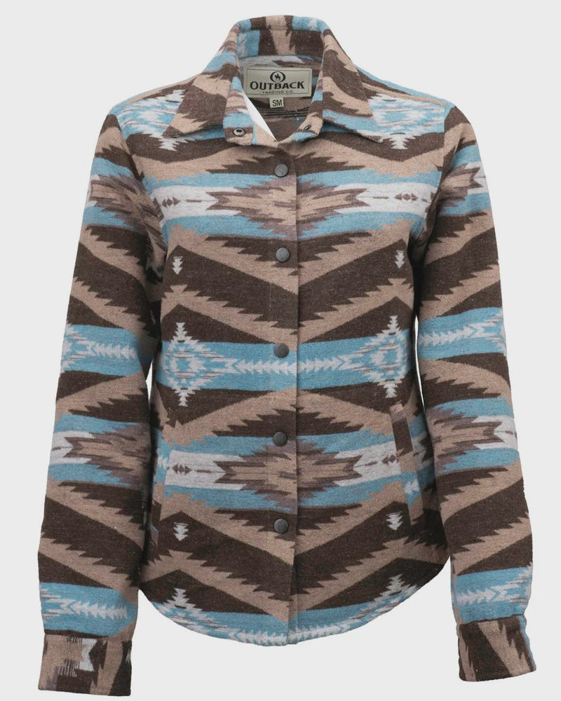 La Daphne Shirt Jacket réinvente la surchemise western avec une touche élégante et moderne. Son motif aztèque aux tons naturels, inspiré des tissus en laine, apporte chaleur visuelle et authenticité. Dotée de boutons-pression et de poignets ajustables, elle allie parfaitement confort, raffinement et esprit du ranch.