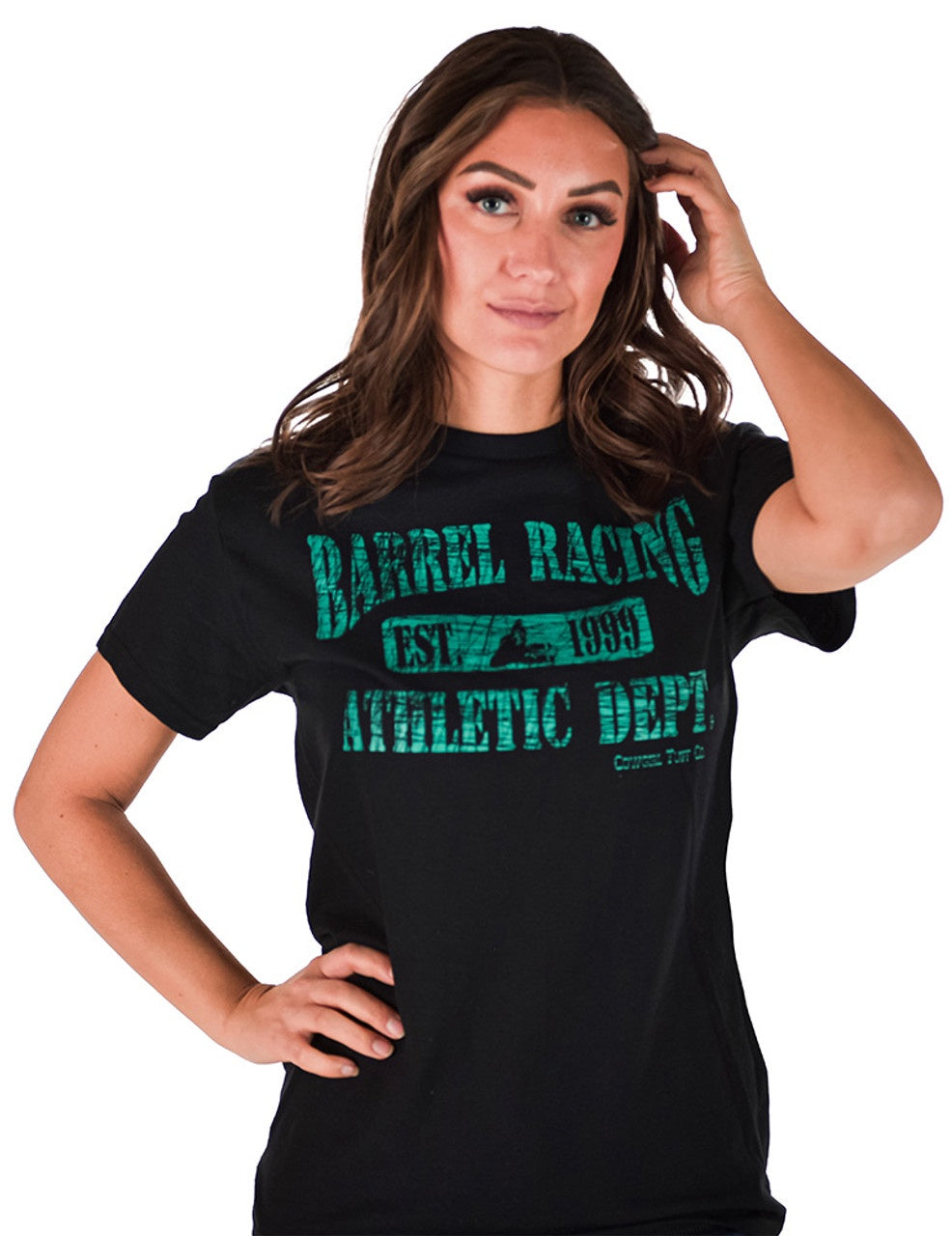 Affichez votre passion pour les courses de barils avec ce t-shirt Cowgirl Tuff Co. Logo Barrel Race pour femme. Arborant un motif turquoise éclatant sur fond noir, il incarne parfaitement l’esprit compétitif et le style western moderne.