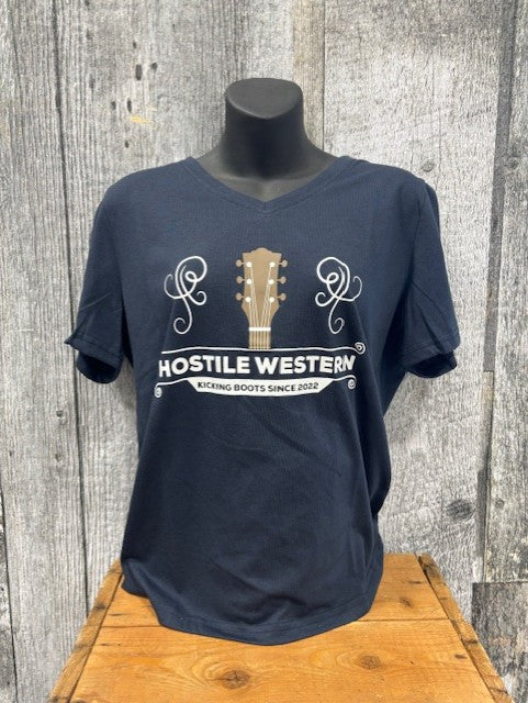Affirme ton style country avec ce t-shirt western bleu marin arborant une guitare centrale et le logo Hostile Western accompagné de la mention Kicking Boots Since 2022. Un design musical et authentique qui reflète parfaitement l’esprit cow-boy moderne. Son col en V flatteur et son tissu doux en font un choix idéal pour les festivals, les spectacles country, les rodéos ou les sorties décontractées.