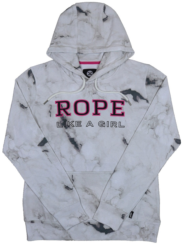 Hooey Hoodie à capuche "Rope Like A Girl" – Blanc marbré – Logo noir et rose