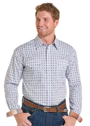 Chemise Western à Manches Longues – Blanc Motif Bleu
