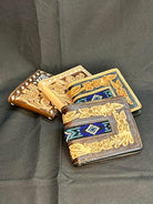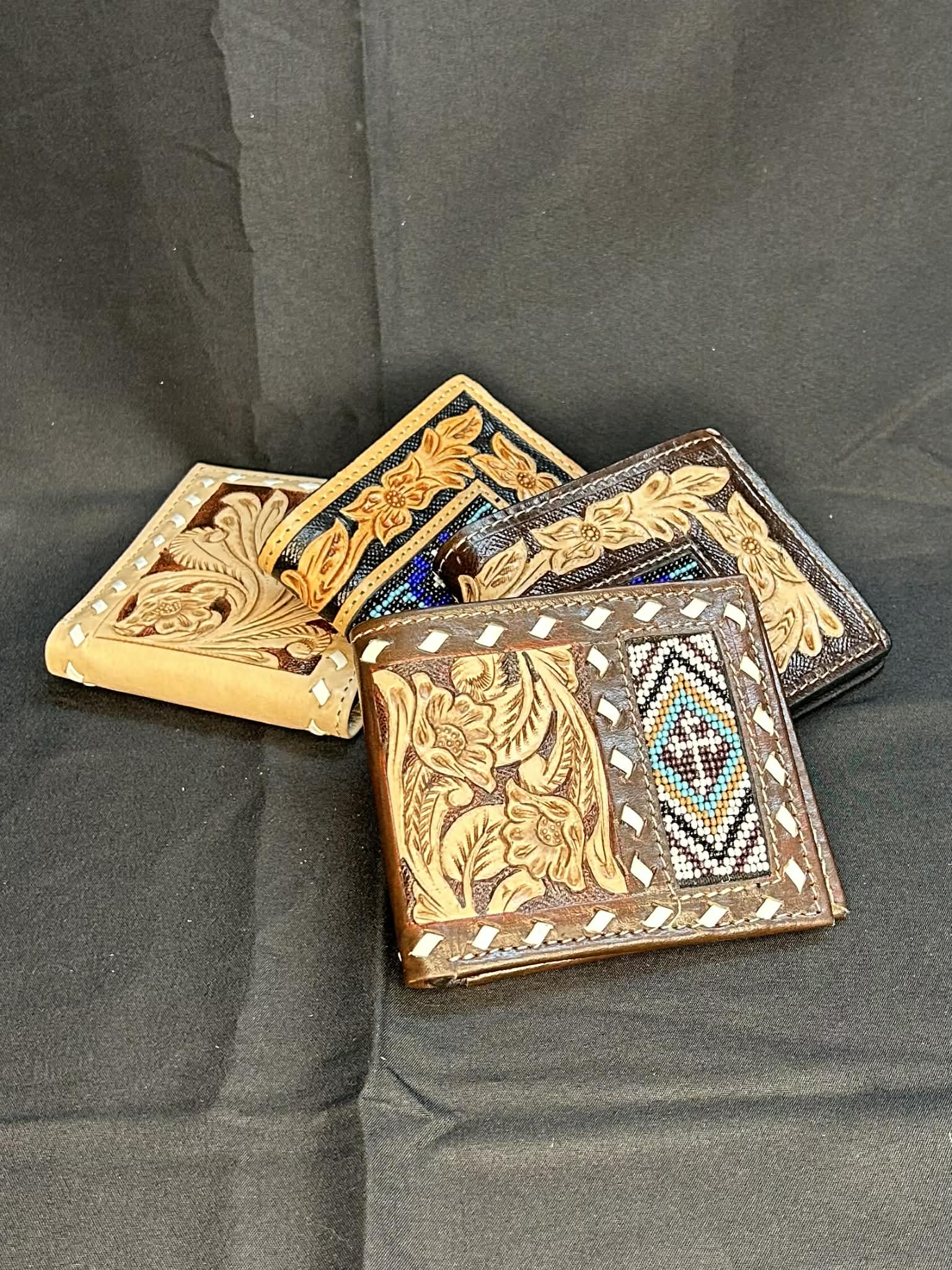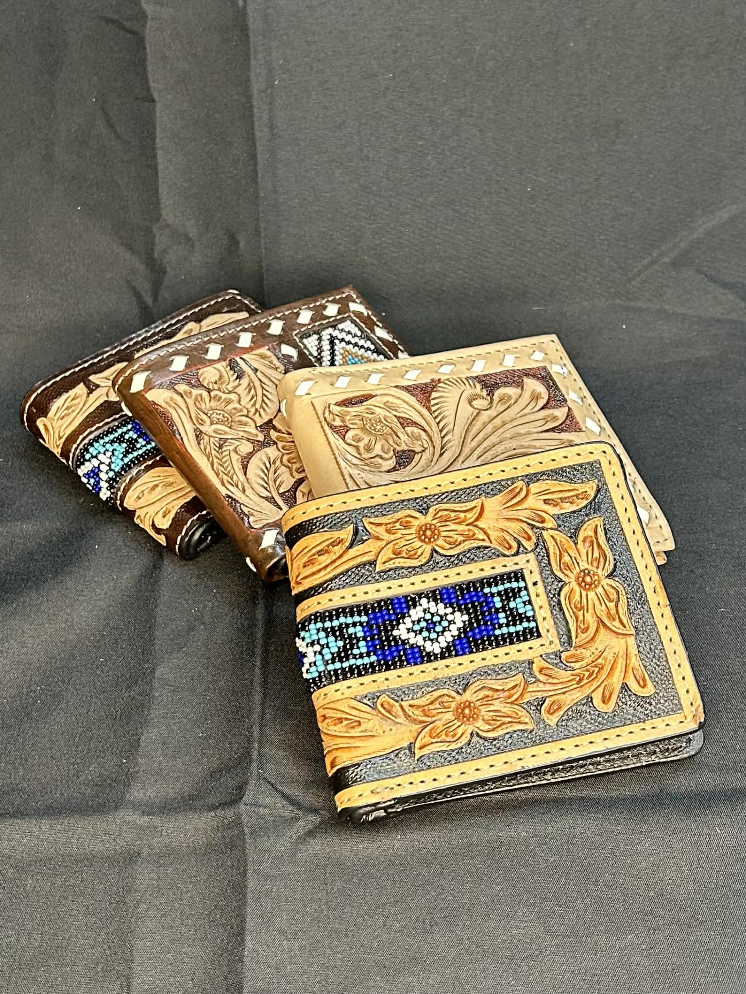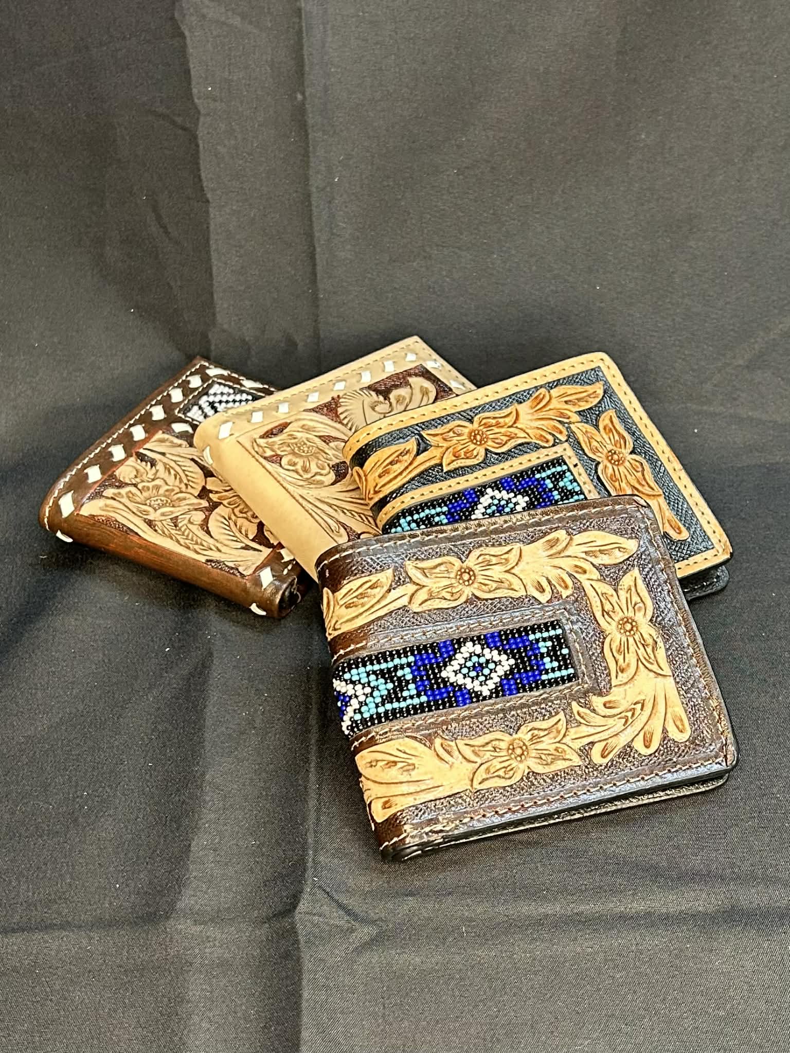 Ce portefeuille western signé Hunt Ranch marie savoir-faire artisanal et authenticité cowboy. Confectionné en cuir véritable finement gravé, il présente des détails floraux embossés et une bande de billes colorées au motif inspiré du style navajo. Compact et élégant, il offre un espace pratique pour les cartes et billets, tout en affirmant un look résolument western.