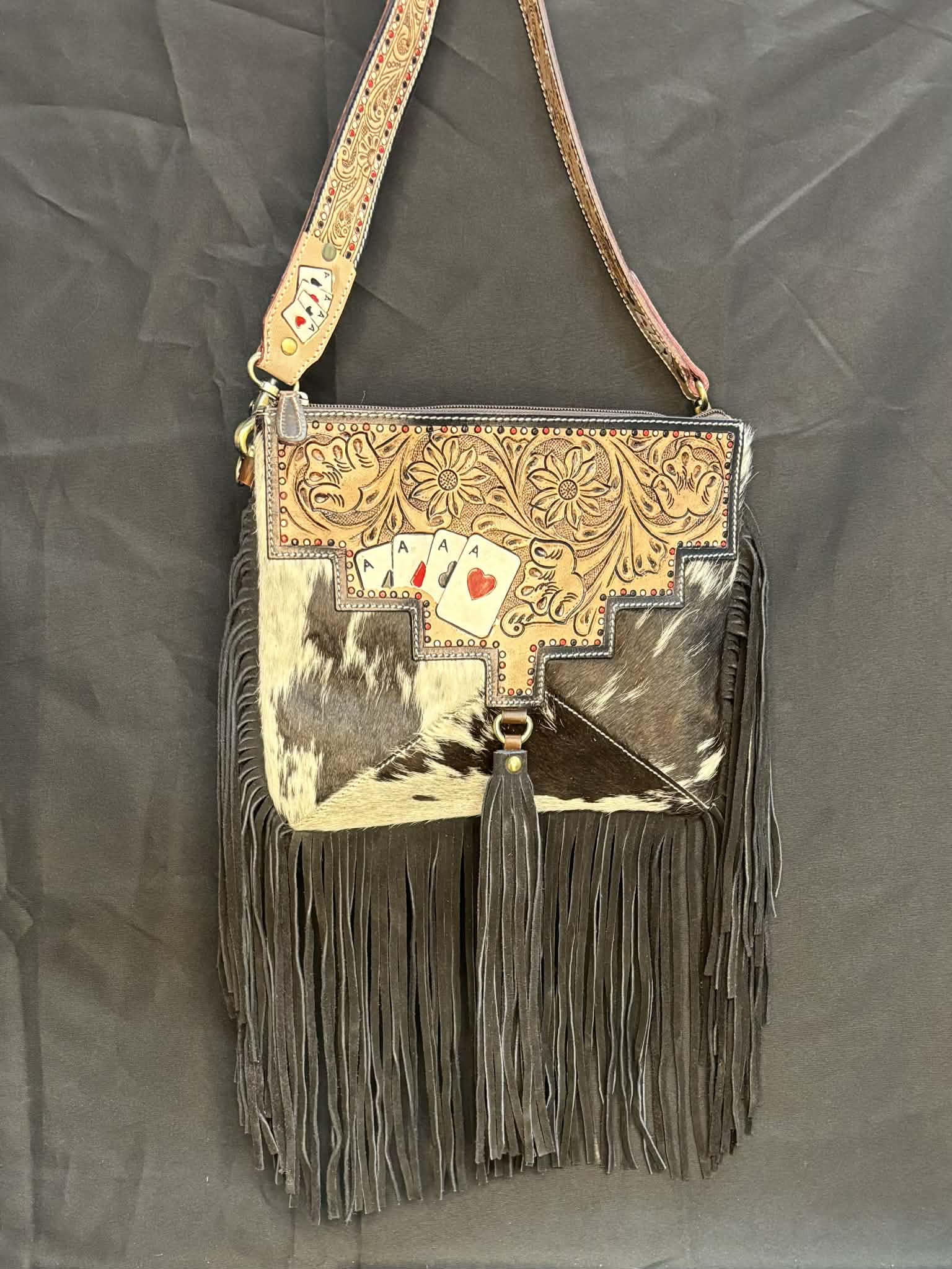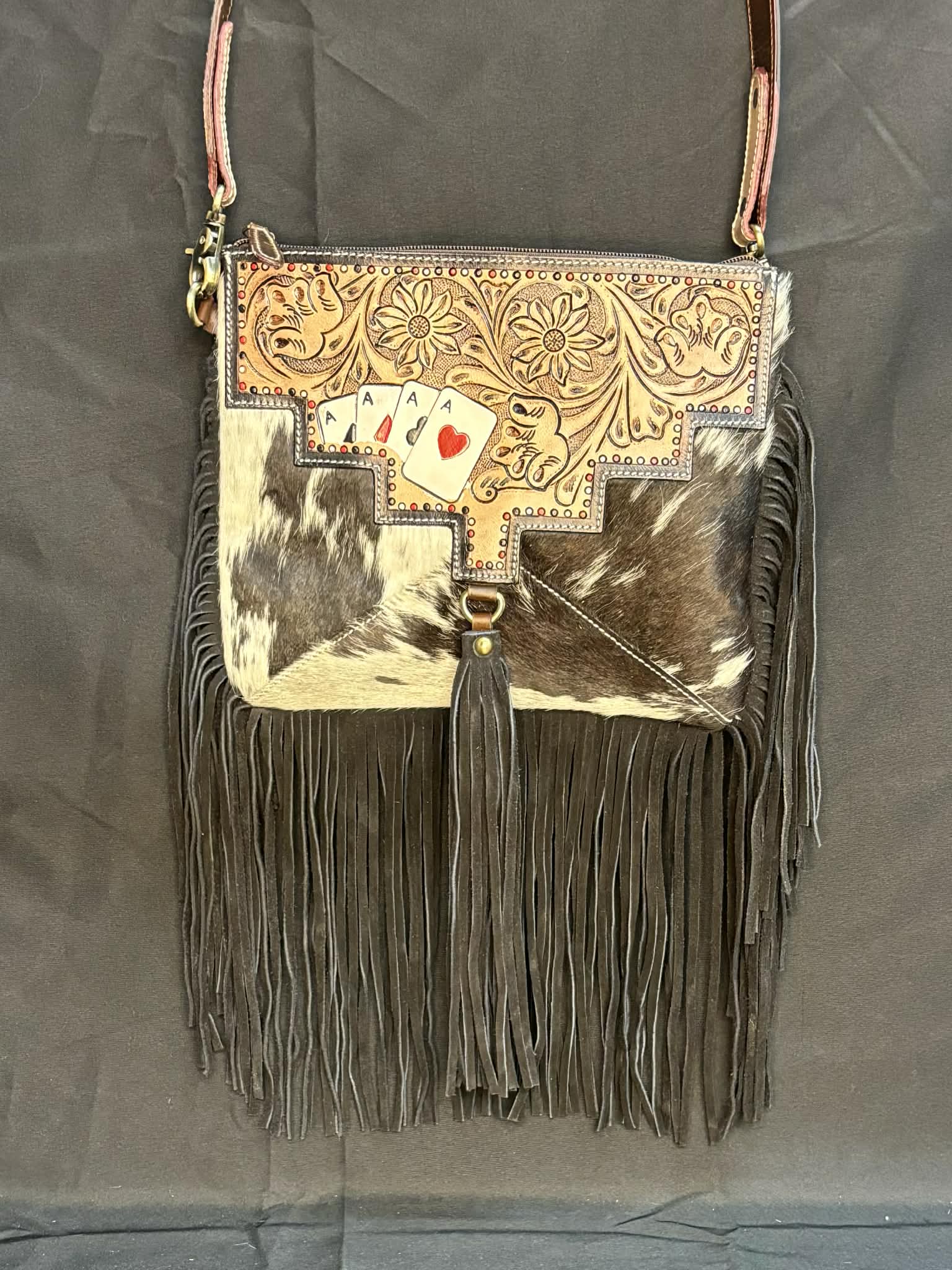 Sacoche Western – Cuir travaillé - jeu de carte, poil de vache & franges