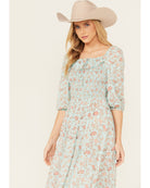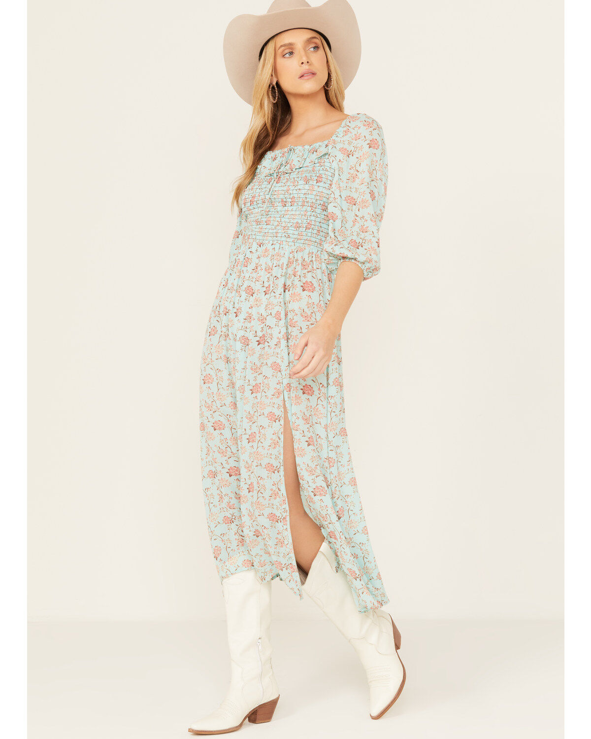 Alliant douceur bohème et élégance western, cette robe florale mauve à motifs roses offre une silhouette fluide et féminine. Son corsage smocké assure un ajustement confortable, tandis que la jupe longue avec fente ajoute du mouvement et une touche raffinée. Une pièce idéale pour les journées estivales, les événements country ou un look western chic.