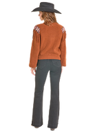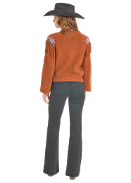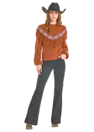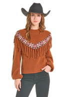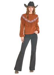 Ce sweater au style western affirmé se distingue par sa large bordure décorative et ses franges frontales qui apportent mouvement et caractère. Inspiré de l’esthétique ranch bohème, il offre une allure chaleureuse et authentique, parfaite pour la saison fraîche. Sa coupe confortable permet de le porter aussi bien avec un jean qu’un pantalon évasé pour un look western moderne et assumé.