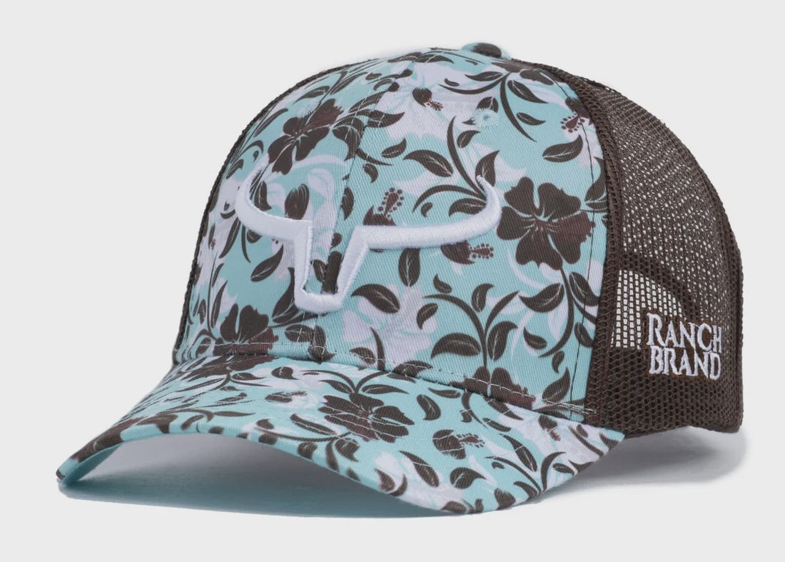 Affirme ton style western avec une touche de fraîcheur grâce à cette casquette Ranch Brand. Son imprimé floral aqua et brun se marie parfaitement avec le logo Longhorn brodé en blanc, symbole d’authenticité et de caractère. Un accessoire idéal pour compléter une tenue western avec élégance et confort.