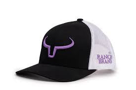 - Logo : brodé mauve en forme de tête de taureau (devant) + logo "Ranch Brand" mauve (côté)