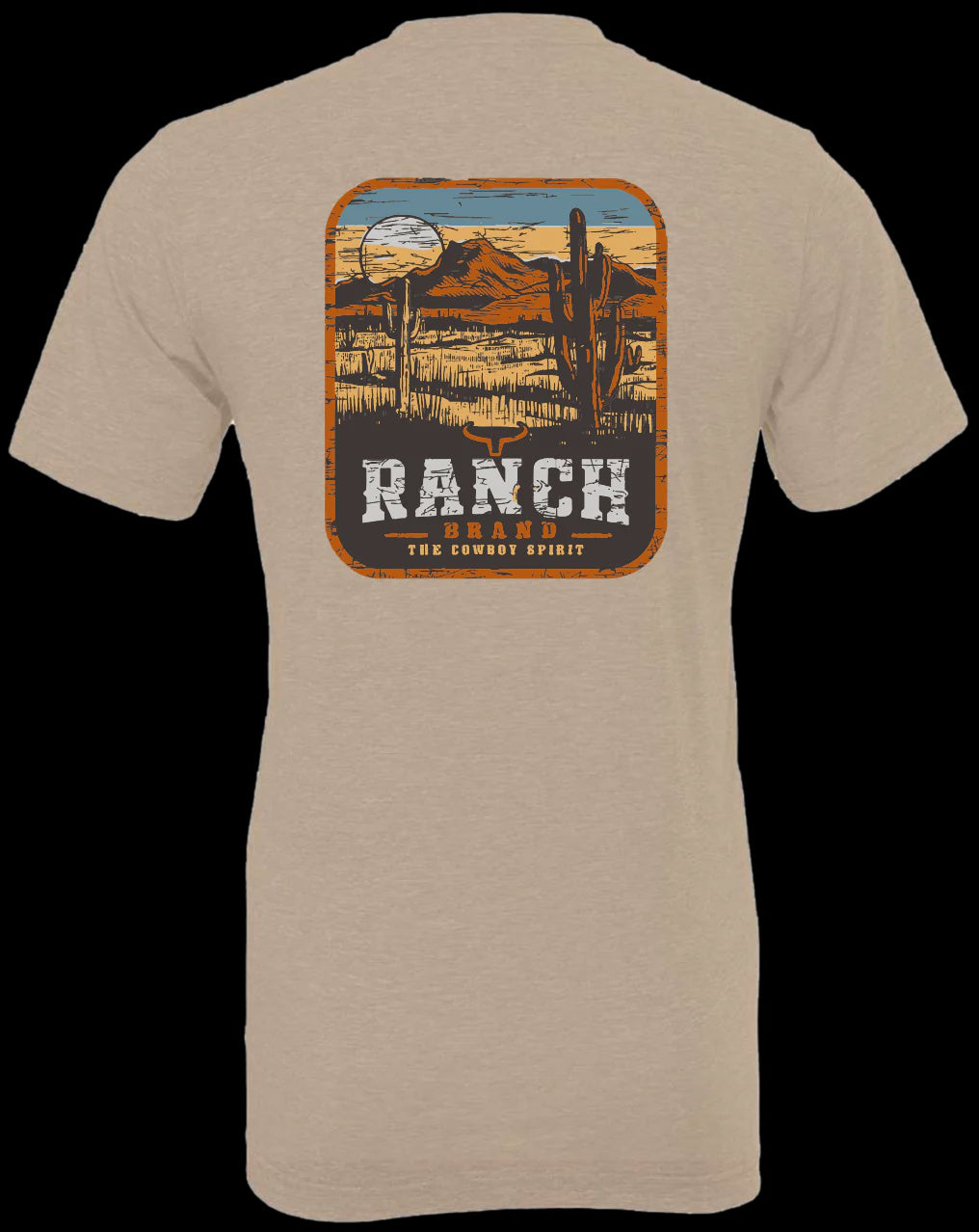 L’esprit du désert s’imprime dans ce t-shirt Ranch Brand au style graphique audacieux. Un paysage de cactus, de montagnes et de soleil couchant vient décorer le dos, affirmant haut et fort le mode de vie cowboy. Un incontournable pour les amateurs de paysages arides et d’aventure western.