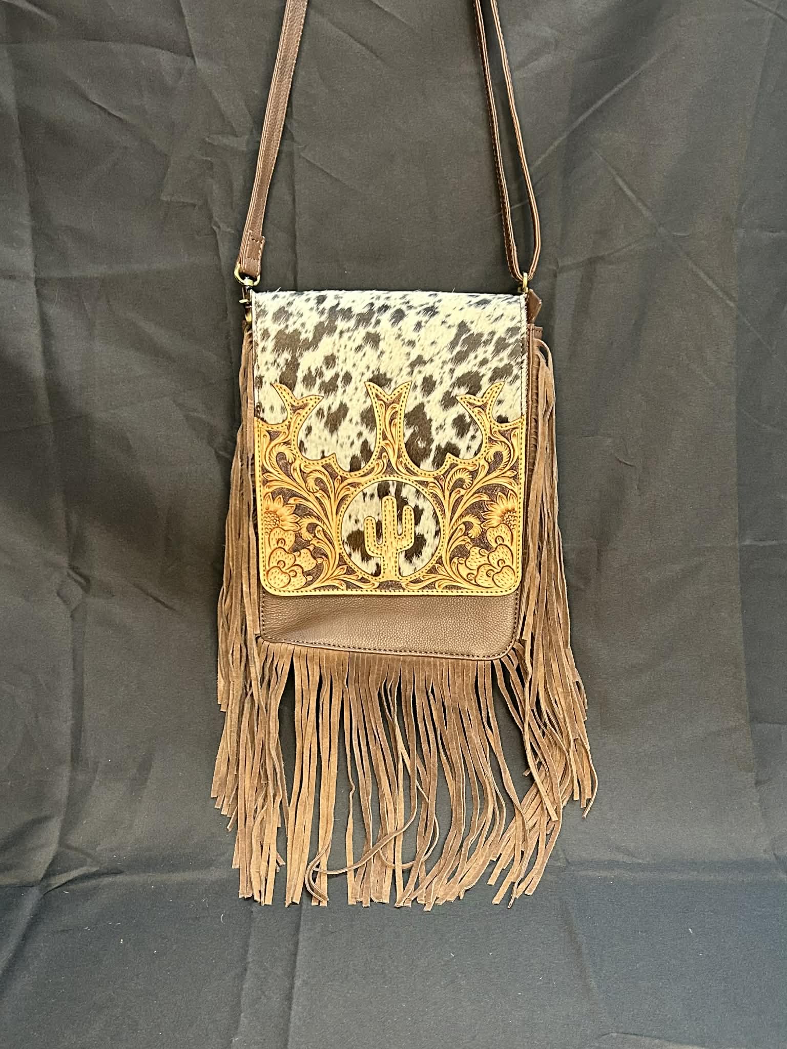 Sacoche crossbody Western – Cuir travaillé, poil de vache & motif cactus