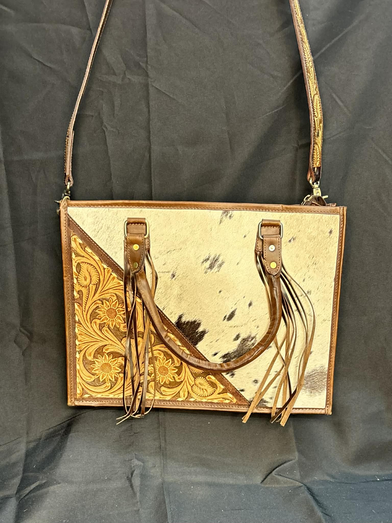 Sacoche Western – Cuir travaillé, couture blanche, poil de vache & frange longue