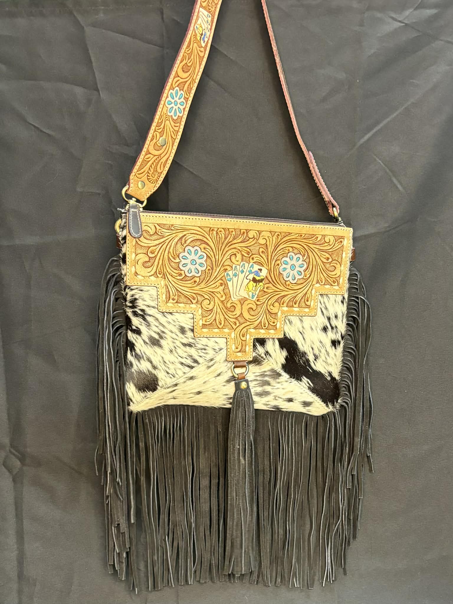Sacoche Western – Cuir travaillé - jeu de carte, poil de vache & franges