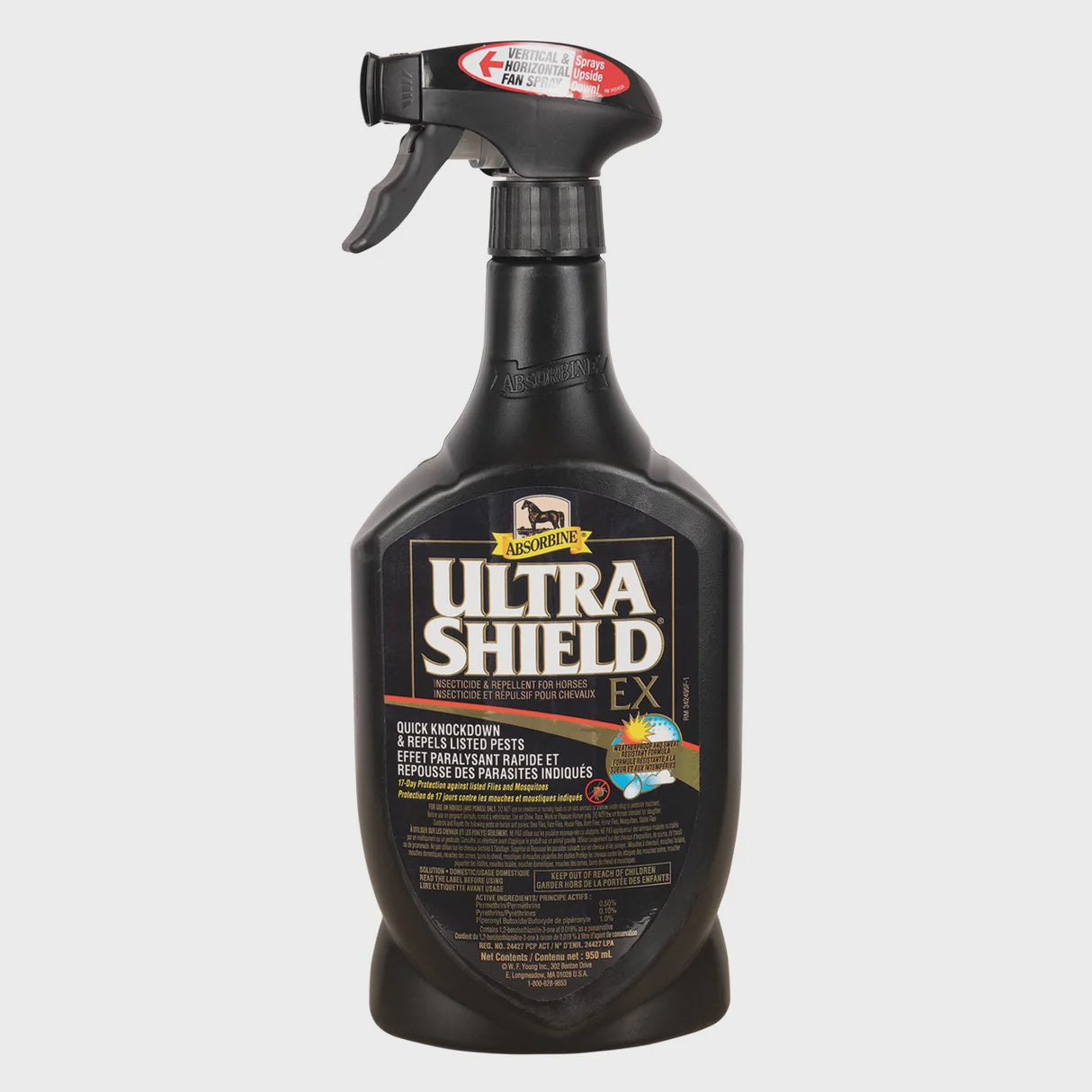 Le répulsif anti-mouches prêt à l'emploi le plus avancé d'Absorbine, résistant aux intempéries et à la transpiration, UltraShield offre jusqu'à 17 jours de protection. La formule agréablement parfumée à la citronnelle peut être utilisée sur les chevaux et les poneys, et contient plusieurs écrans solaires et revitalisants pour le pelage, tels que l'aloès et la lanoline. Repousse les mouches piqueuses, les moustiques et les moucherons pour mettre fin à la frustration des mouches dans le ring, l'écurie et le paddock. 950 ml. Embout pulvérisateur inclus.
