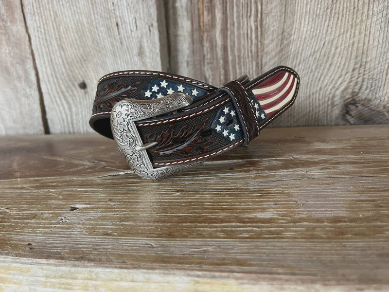 Ceinture 1 1/2” (38mm) Gland et drapeau américain usiné à la main et à la main cuir véritable peint, boucle en finition argentée.