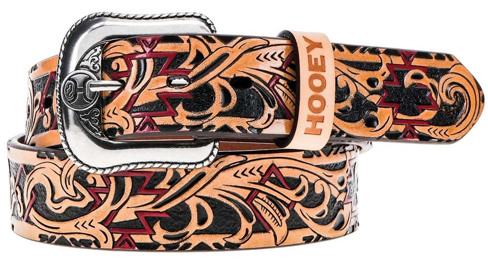 Affiche fièrement ton style western avec la ceinture Hooey Sundown 1.5 en cuir pleine fleur tan. Son filigrane aztèque embossé sur toute la longueur est rehaussé par des accents peints noirs et rouges, ajoutant une touche de contraste et de caractère unique à cette pièce haut de gamme.