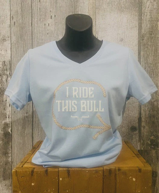 T-Shirt Col en V Western - I Ride This Bull – Bleu Pâle
