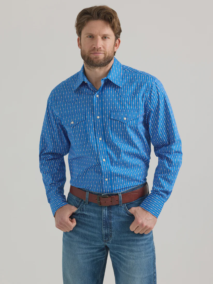 Adoptez un look western audacieux avec cette chemise Wrangler pour homme, ornée d’un imprimé géométrique dans des tons de bleu et violet. Conçue pour allier style et confort, elle est idéale autant pour le quotidien que pour les événements western.