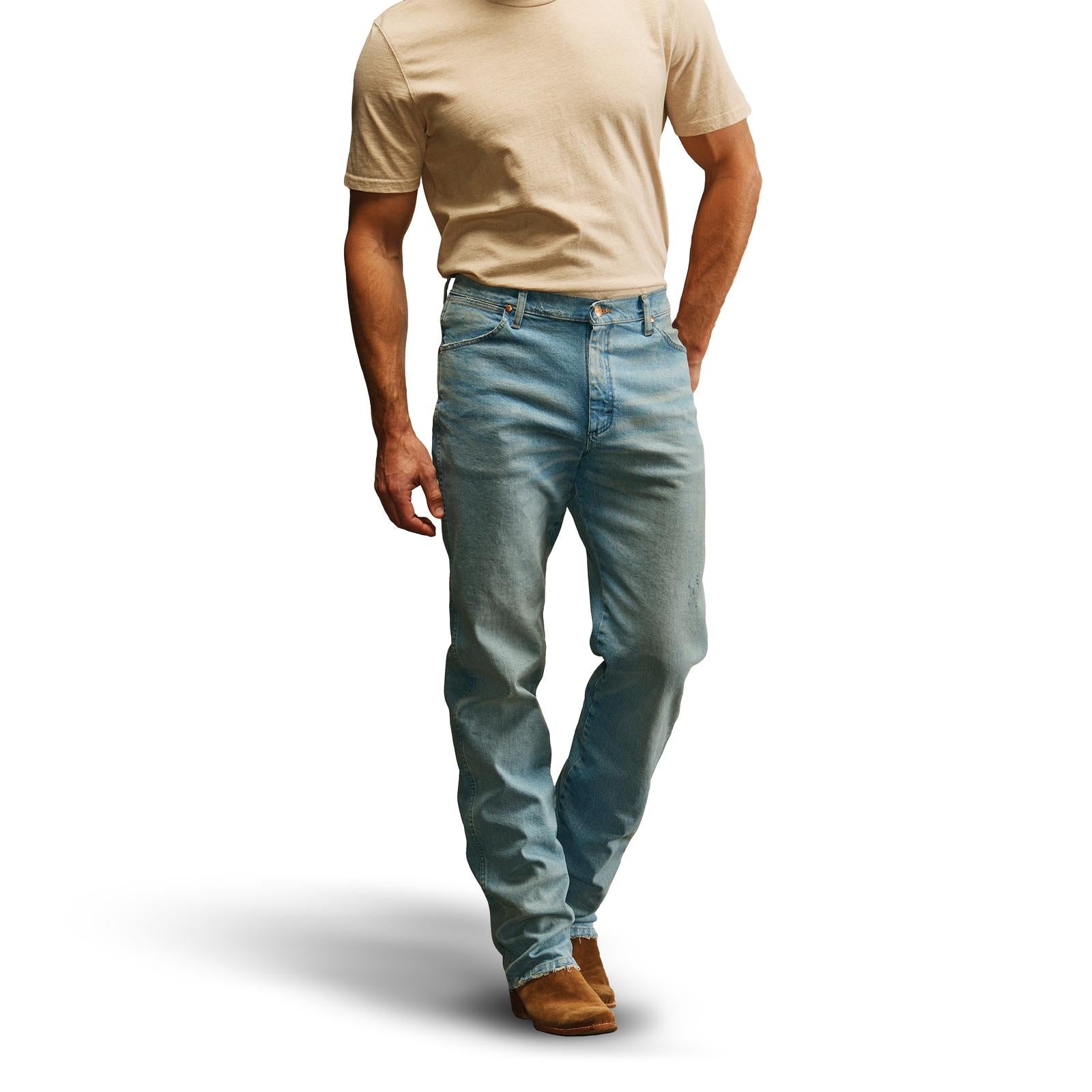 Inspiré des archives Wrangler®, ce jean vintage moderne allie style authentique et confort actuel. Le modèle Worn In propose un délavage bleu moyen vieilli, avec des effets usés naturels aux cuisses et aux genoux, pour un look à la fois brut et travaillé.