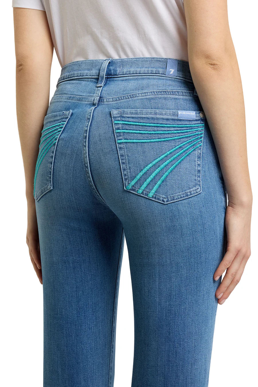 Détails : Broderies turquoise contrastantes sur les poches arrière, denim doux