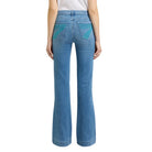 Jeans flare au look frais et lumineux, avec un denim bleu pâle et des broderies turquoise éclatantes sur les poches arrière. Sa coupe Dojo emblématique met en valeur la silhouette tout en offrant confort et style.
