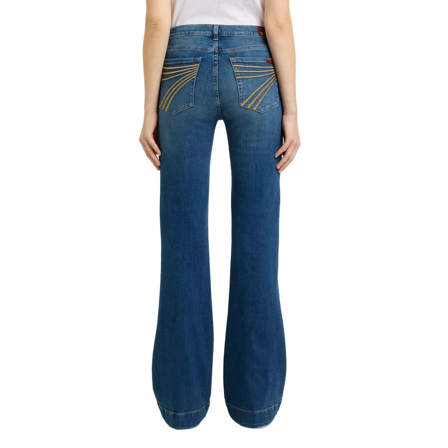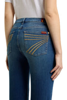 Jeans flare au style rétro marqué, avec un denim bleu vintage et des broderies contrastantes emblématiques sur les poches arrière. Sa coupe Dojo allonge la jambe et offre un look western tendance et féminin.