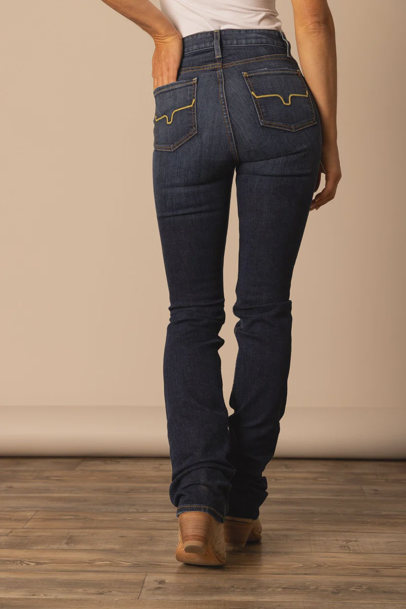 Le jeans Sarah de Kimes Ranch combine modernité et esprit western authentique. Avec sa taille haute bien définie et sa coupe ajustée à la cuisse qui s’évase légèrement vers le bas, il met en valeur la silhouette tout en gardant le confort nécessaire pour la vie de tous les jours. Sa teinte indigo foncé avec surpiqûres contrastantes et poches arrière emblématiques fait de ce jeans un incontournable aussi bien pour les rodéos que pour les sorties en ville.