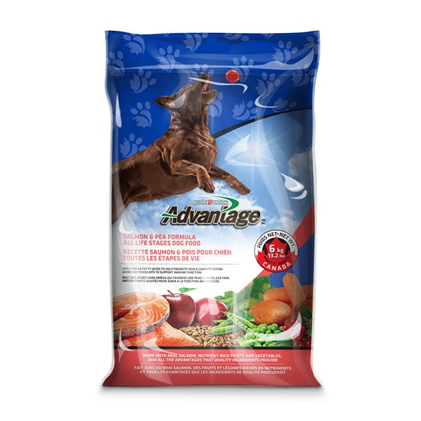 Saumon, pois, farine de sous-produits de volaille, farine de porc, gras de volaille (conservé avec un mélange de tocophérols), orge entier moulu, graines de lin, pulpes de bettraves déshydratées, arômes naturels, huile de saumon, pommes entières sèches, carottes entières sèches, canneberges entières sèches, épinards entiers secs, patates douces entières sèches, tomates entières sèches, minéraux chélatés
