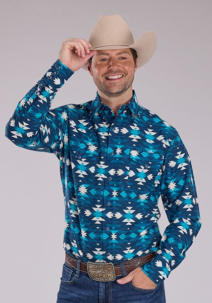 Affirme ton style western avec cette chemise Roper à manches longues au motif Aztec Serape. Avec ses teintes vibrantes de bleu, turquoise et blanc, elle combine l'allure traditionnelle avec une touche contemporaine, parfaite pour les rodéos, les soirées country ou un look quotidien audacieux.