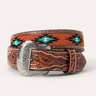 Une ceinture audacieuse qui célèbre l’art du western. Conçue en cuir pleine fleur de teinte naturelle, cette ceinture Roper se démarque par ses extrémités finement ciselées à la main et ses bordures travaillées. Son centre met en valeur un motif brodé vibrant aux tons turquoise, noir et blanc sur fond orange rustique. La boucle Stetson® argentée rehausse le tout avec autorité.