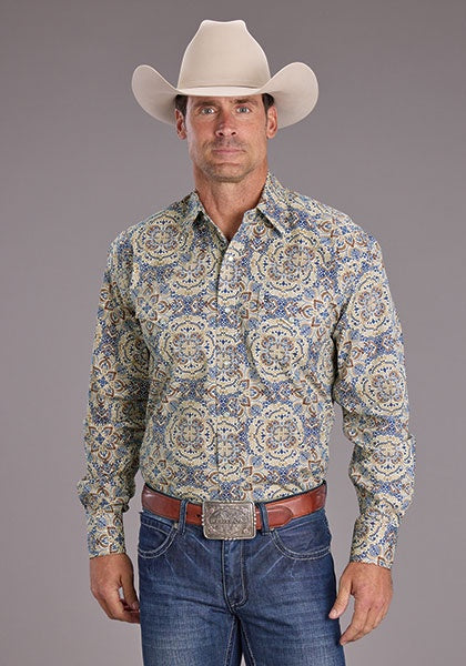 Stetson – Chemise à Manches Longues Western – Motif Médaillon Jaune et Bleu Marine – Boutons Pression
