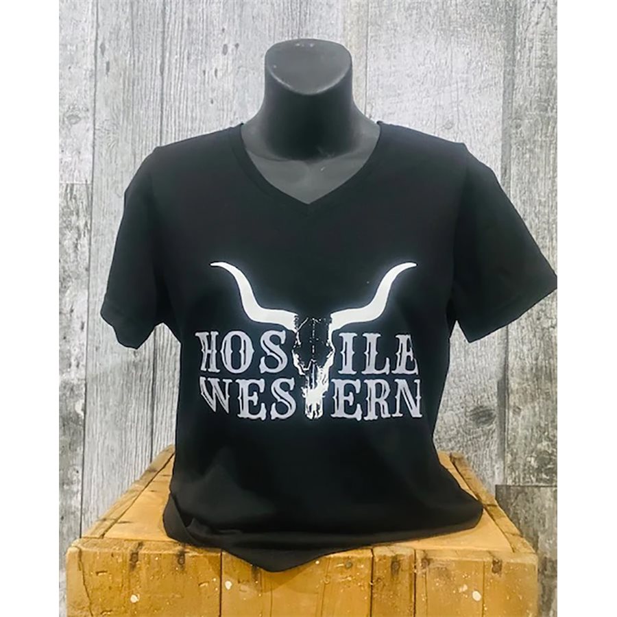 Affiche ton côté cowgirl avec ce t-shirt western noir orné d’un crâne longhorn stylisé, dont les cornes forment les lettres T du logo Hostile Western. Un design audacieux et 100 % country qui se démarque autant en festival, au ranch que dans la vie de tous les jours. Son col en V et son tissu doux assurent un confort optimal tout en mettant en valeur un style western assumé.